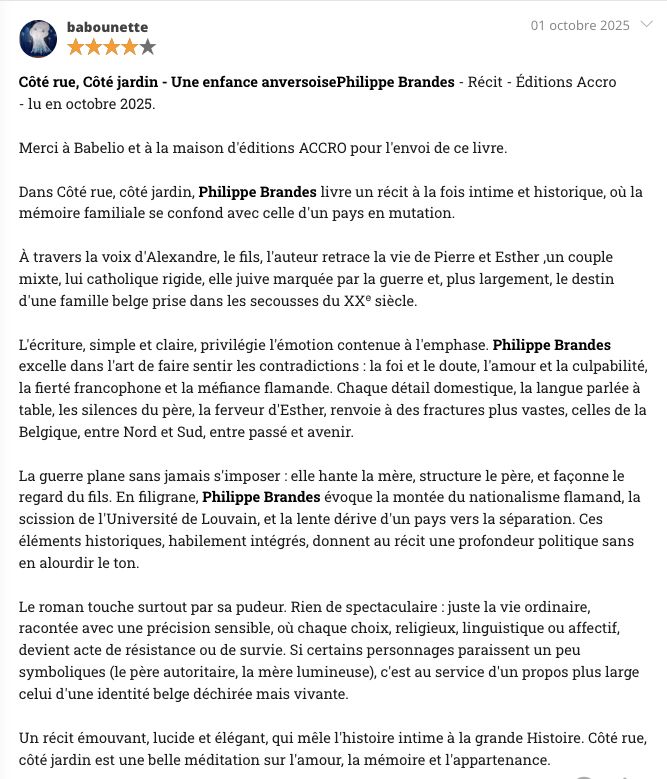 Dans "Côté rue, côté jardin" nous sommes plongés au cœur de l'enfance et de l'adolescence d'Alexandre, le fils d'un mariage mixte entre un père psychiatre fervent catholique et amateur de littérature et une mère juive, jeune beauté sensible et mystérieuse, traumatisée par la guerre. C'est un livre riche et profond, admirablement écrit, qui explore avec grâce plusieurs sujets intéressants : la famille, la dualité linguistique, la dualité religieuse entre ses parents, la pratique de la psychiatrie, mais aussi la découverte de l'amour et de la sexualité. "Côté rue, côté jardin" se laisse dévorer d'une traite. Il ne manque plus qu'une visite de la ville d'Anvers !